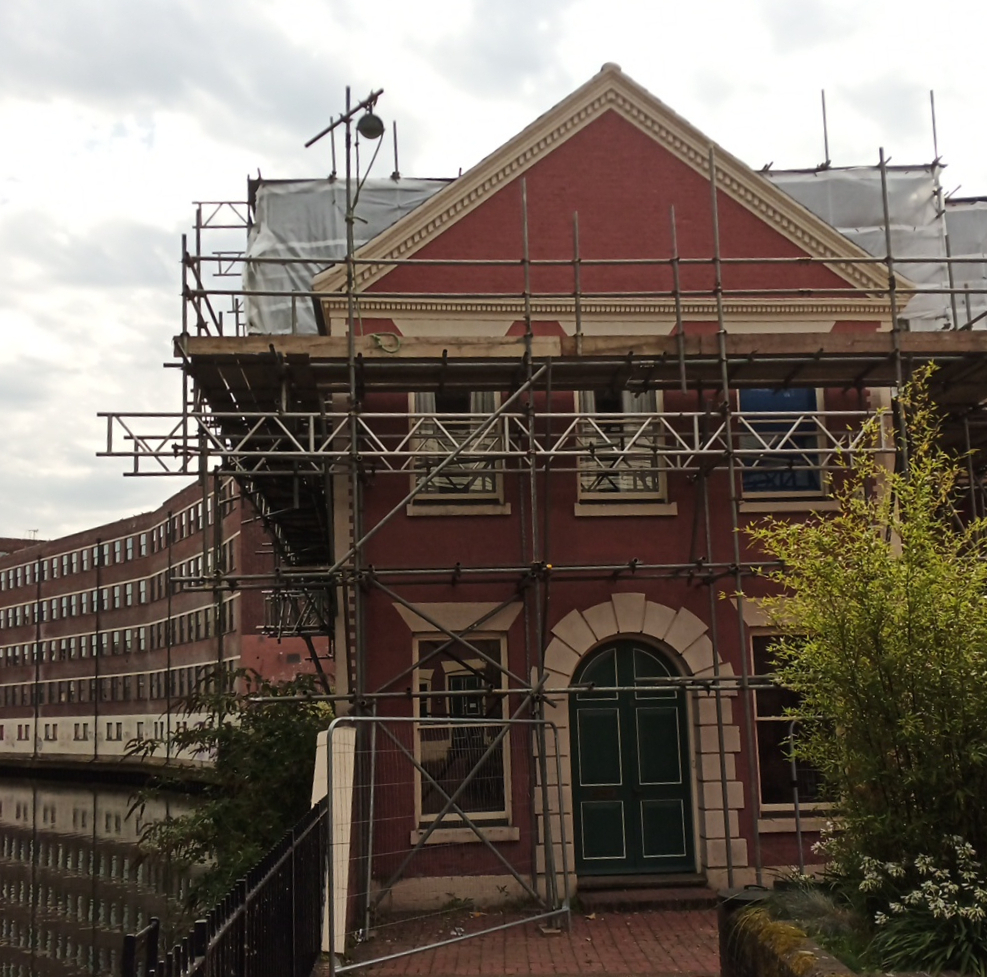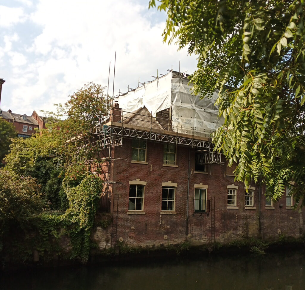 The property is part of the Bullard & Sons Anchor Brewery, a historic listed building now converted into riverside homes. Its location on the banks of the River Wensum has required the design and installation of a specialist tin hat scaffold to allow works to be carried out safely and without the need for supports in the water.